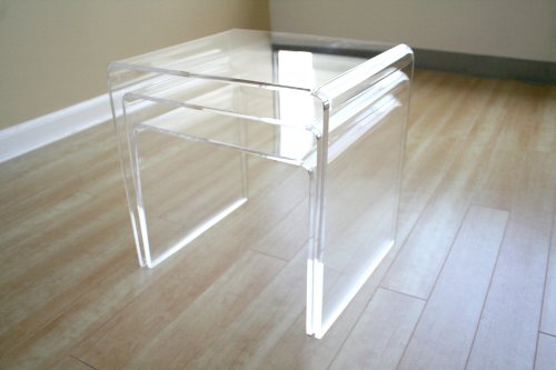 Aville Acrylic Nesting Tables Display Stands - 3 Piece Set. The contemporary, versatile design of this set of three Acrylic Nesting Coffee Tables is sure to impress in your home or office. Set includes three end tables of graduating sizes. Made of 100-percent acrylic. Smooth, clear design functions in any decor .These modern tables can be stored together or used separately. Eliminate the hazards of glass, keep the elegant look -- this table set is made of high quality acrylic. This set of three nesting tables feature three different sizes and is multifunctional. These end tables are lightweight and can be stored easily when not in use. The acrylic coffee tables match well with casual seating systems and can even be used in the office. Dimensions: 13"L x 16"W x 16"H Order yours from Brookstone today!