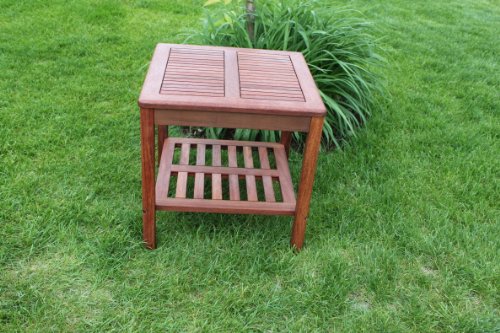 This is a nice size and well-designed table for a patio chairside table. I particularly liked the feature of a bottom shelf. I believe it was made in Vietnam and I don't think quality control is on their list. Some mars on the top and the legs, variable colors in the wood, a little difficult to put together, but overall a nice table. Since it is used outdoors, I am less concerned that it be perfect as the weather will eventually get it anyway.