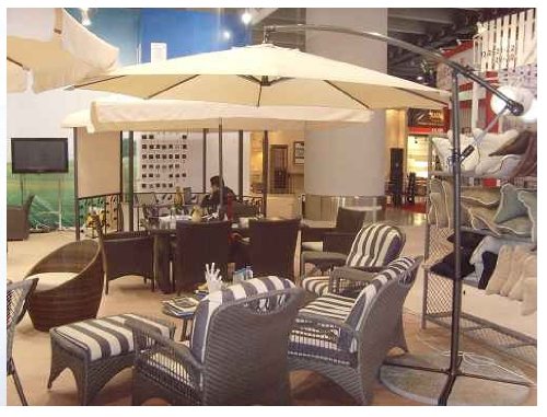 Fabric: 180G polyester Aluminium frame hanging umbrella with detachable crank. Banana shape 3 meters (approx 10' feet) wide beige parasol , with polyester fabric and aluminium frame.