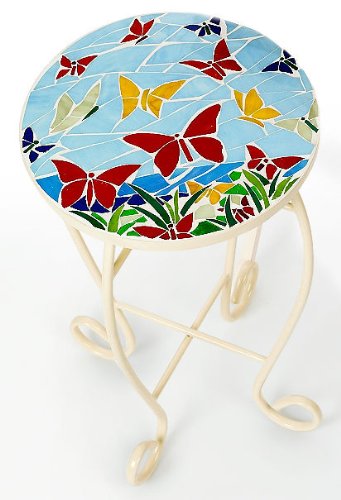 A decorative piece of furniture! This colorful accent table features an exquisite mosaic butterfly design. Some assembly may be required. Measures 14'' x 23''. Glass.